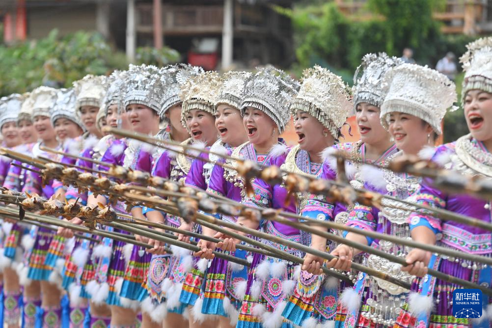 10月18日,在柳州市融水苗族自治县安太乡培秀村,村民们向游客展示刚刚烧好的鱼。