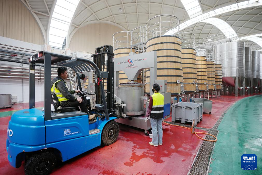工作人员在银川市永宁县闽宁镇的贺兰红酒庄对酿酒葡萄进行压榨处理(10月14日摄)。
