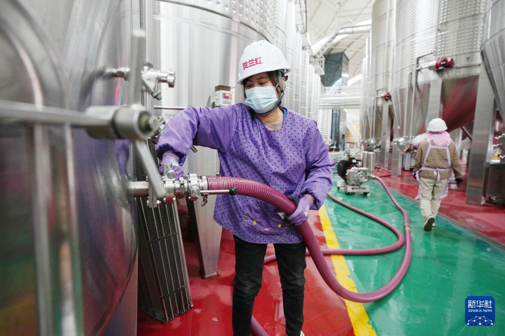 工作人员在银川市永宁县闽宁镇的贺兰红酒庄输送葡萄汁(10月14日摄)。