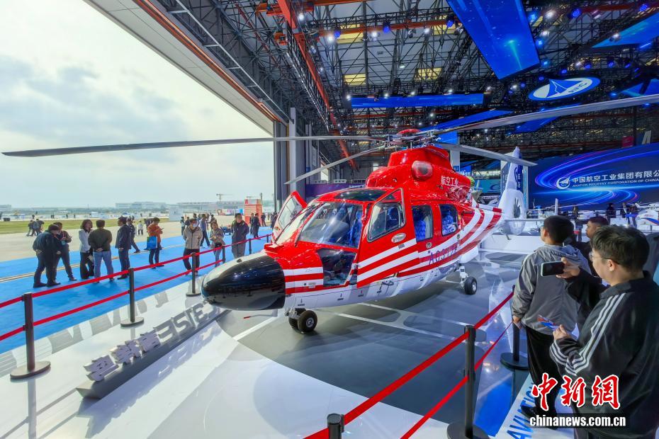 10月16日,天津,观众在中国航空工业集团展台参观AC312E“吉祥鸟”直升机。当日,第七届中国天津国际直升机博览会开幕。本届博览会吸引了来自30余个国家和地区的近400家企业参展,集中展示全球直升机、无人机等通用航空和低空经济领域的新技术、新产品、新成果。