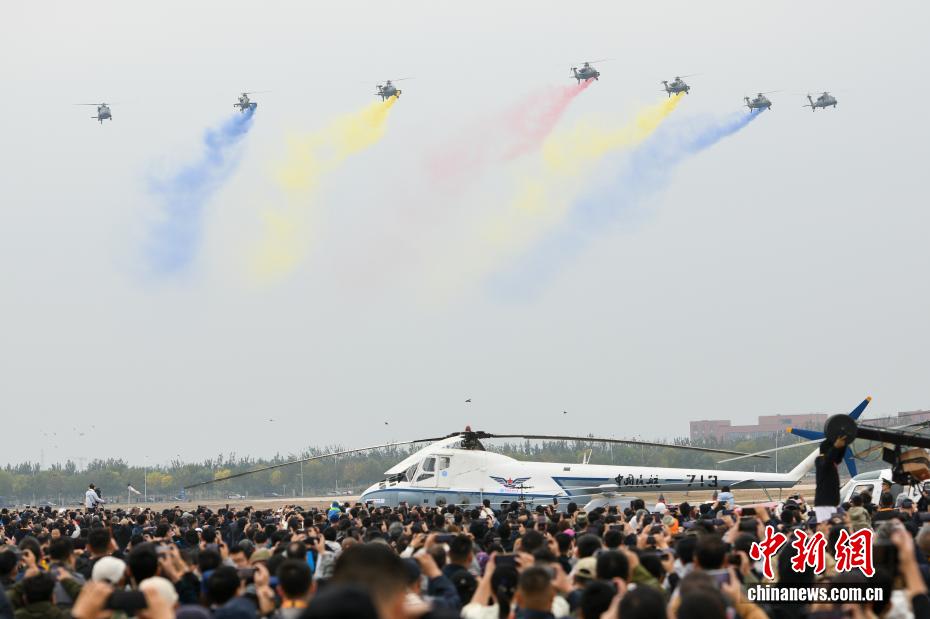 10月16日,天津,观众观看中国陆军“风雷”飞行表演队特技飞行表演。当日,第七届中国天津国际直升机博览会开幕。本届博览会吸引了来自30余个国家和地区的近400家企业参展,集中展示全球直升机、无人机等通用航空和低空经济领域的新技术、新产品、新成果。