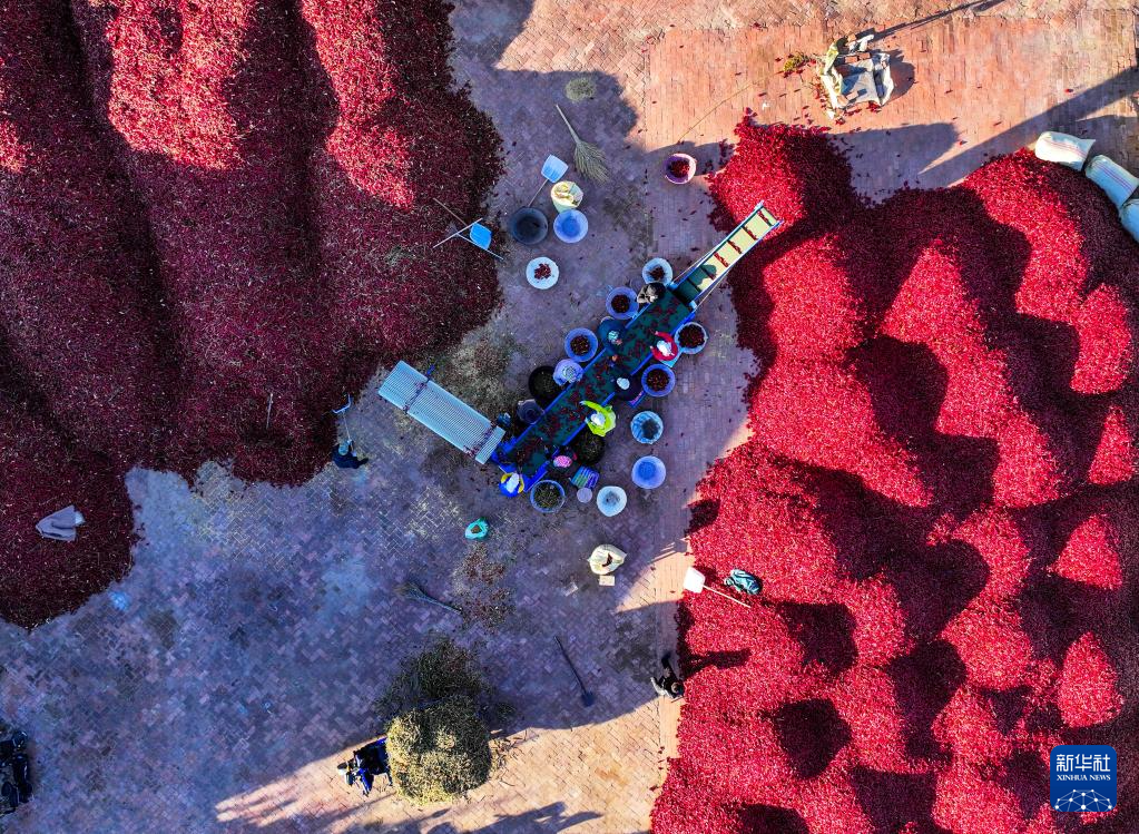 10月19日,在通辽市开鲁县东风镇六合堂村,村民在分拣红干椒(无人机照片)。