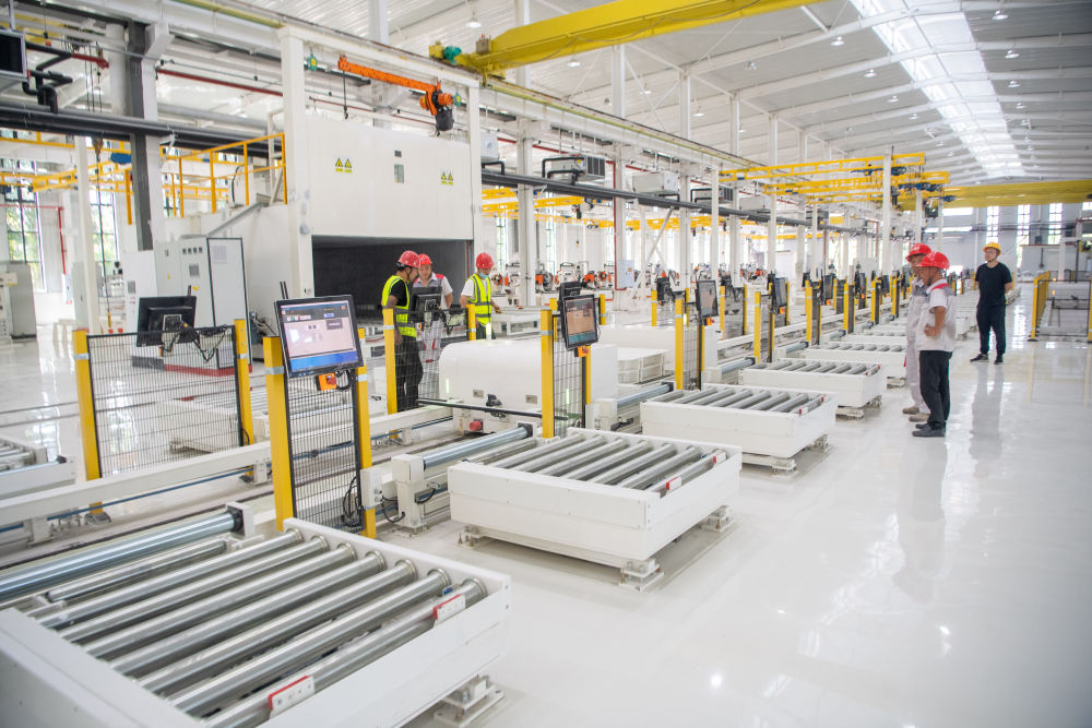 8月14日,在重庆市涪陵区的“国家级绿色工厂”重庆南瑞博瑞变压器有限公司,工作人员在车间内调试新生产线。该企业先后成功研制35kV、66kV天然酯绝缘油变压器,以生物降解油替代传统矿物油。新华社记者 唐奕 摄
