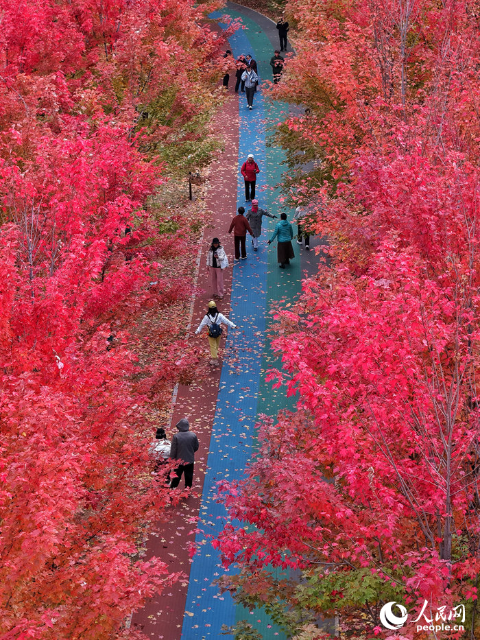 人民网长春10月21日电 (记者李洋)近日,位于吉林长春的月荷文化园秋意正浓,步行道两侧的枫树换上了迷人的“红妆”,吸引着市民游客共赴“枫”情盛宴。