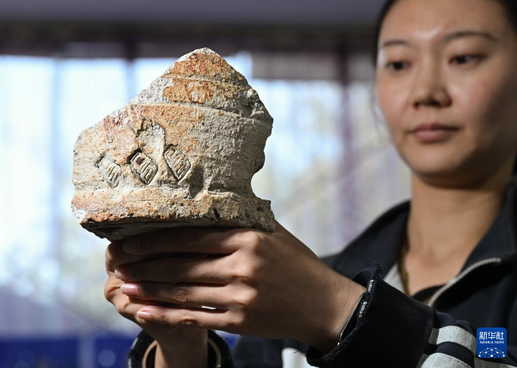 一位工作人员在苏峪口瓷窑址考古队文物库房内展示遗址出土的带有“官”字款的匣钵残片(10月13日摄)。