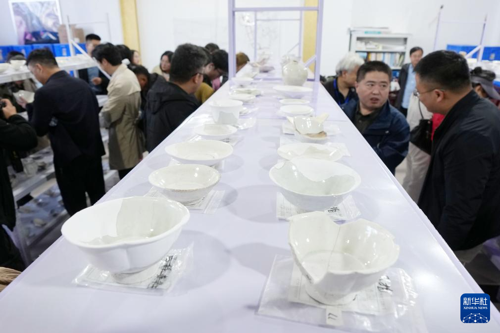 考古学家们在苏峪口瓷窑址考古队文物库房内对出土瓷器进行考察(10月13日摄)。