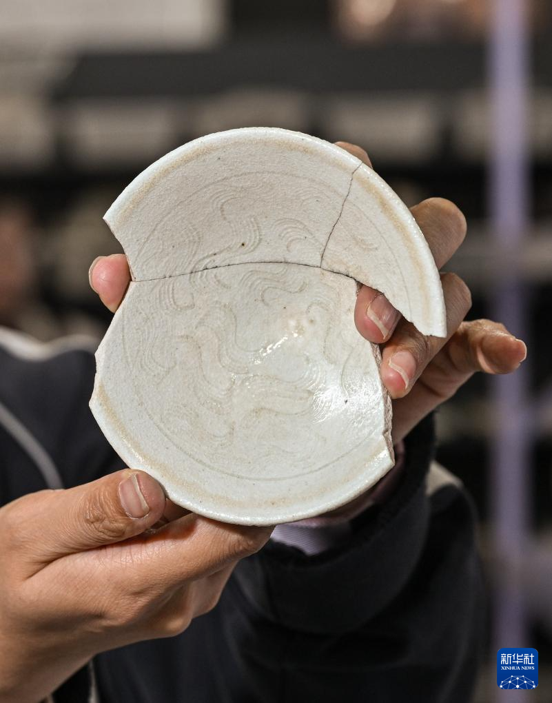 工作人员在苏峪口瓷窑址考古队文物库房内展示发掘出土的带有刻划花纹的瓷器残片(10月13日摄)。
