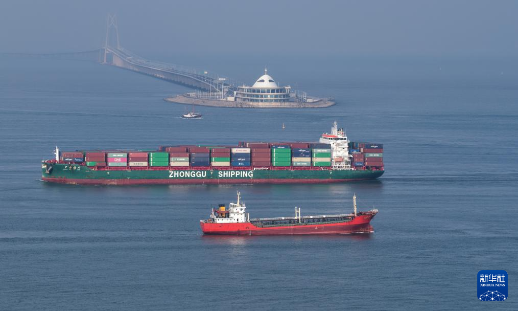 在伶仃洋主航道上的船舶驶过港珠澳大桥西人工岛(10月19日摄,无人机照片)。