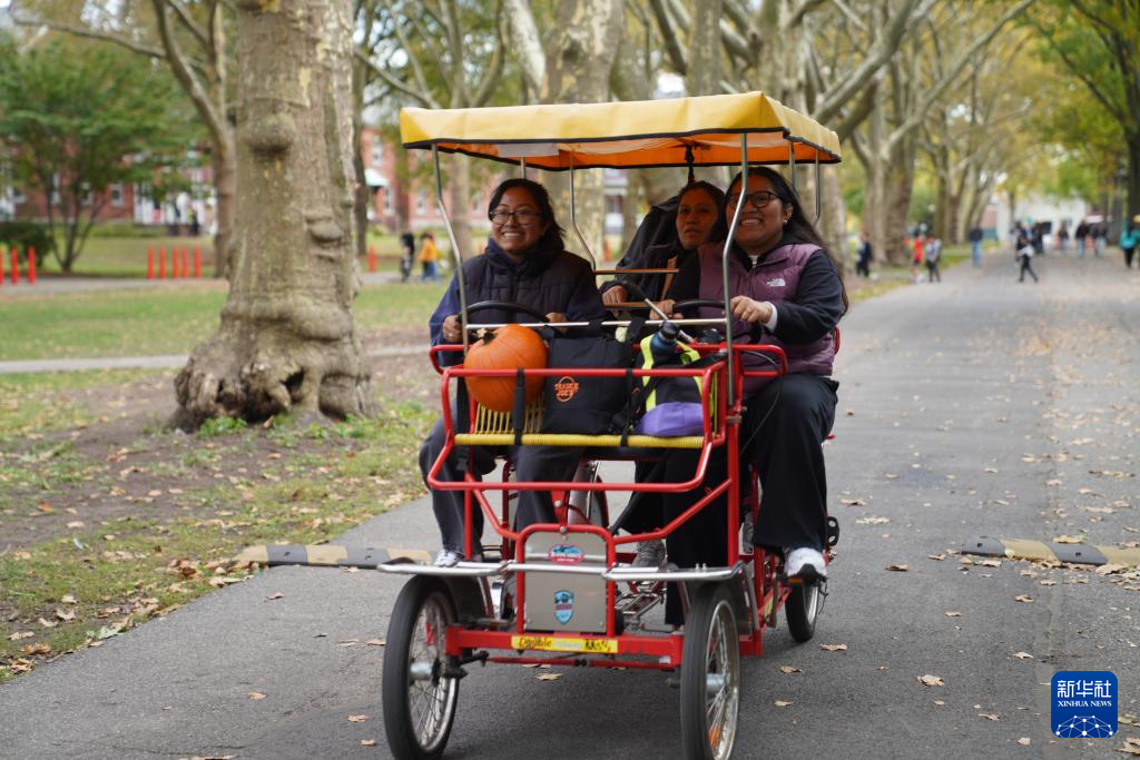 10月25日,在美国纽约总督岛,人们骑行在一条落叶大道上。