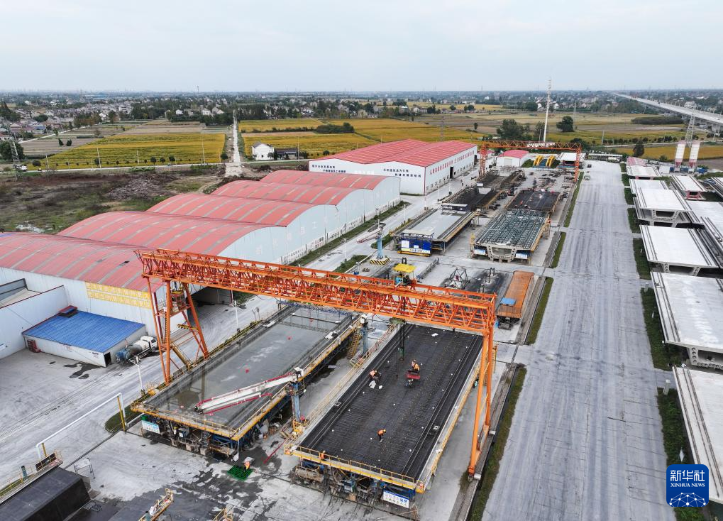 10月27日,工人在中铁十一局沪渝蓉高铁沪宁段搬经制梁场作业(无人机照片)。