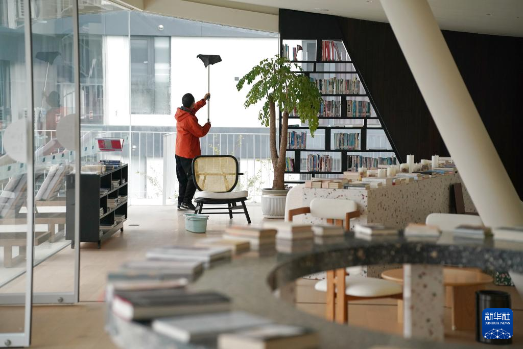 10月29日,在镇坪县牛头店镇国庆村,一家山居酒店工作人员在酒店书吧内打扫卫生。