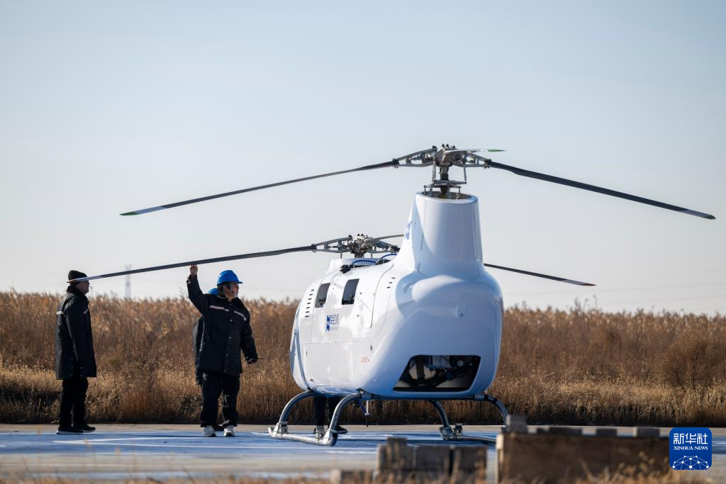 10月30日,在哈尔滨市平房区的哈尔滨联合飞机科技有限公司,工作人员在T1400无人直升机降落后检查。