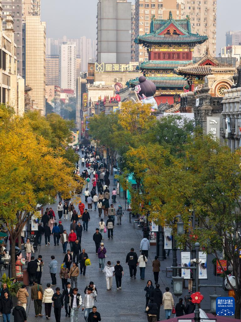 游客在钟楼街行走(无人机照片,10月29日摄)。