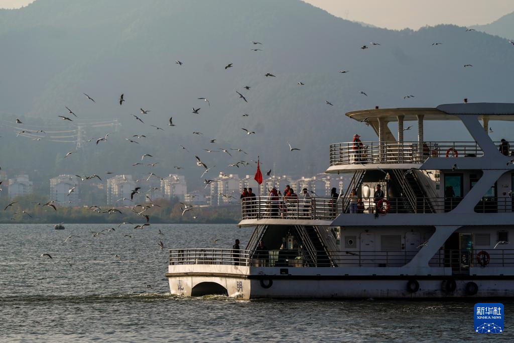 11月1日,游客在滇池乘坐游船游玩、喂鸥。