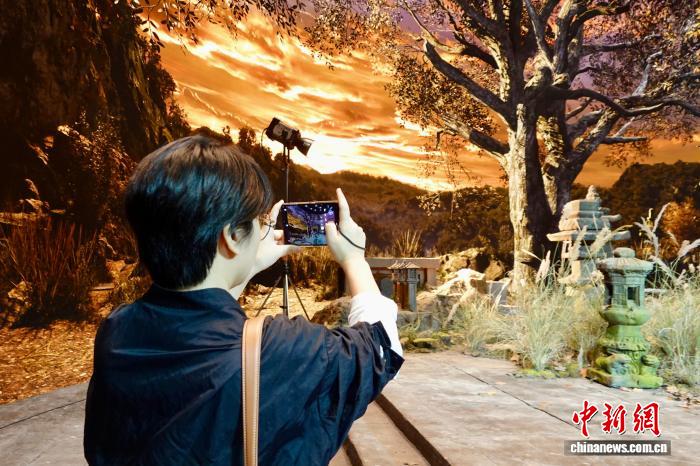 11月2日,影视从业者在浙江东阳横店影视产业园13号棚的虚拟制作基地参观,了解LED屏幕实时呈现的虚拟场景如何与演员、部分实景相配合,形成“所拍即所得”的高效制作体验。图为参观者拍摄实时呈现虚拟场景的LED屏幕与实景的融合效果。中新社记者 刘子琳 摄